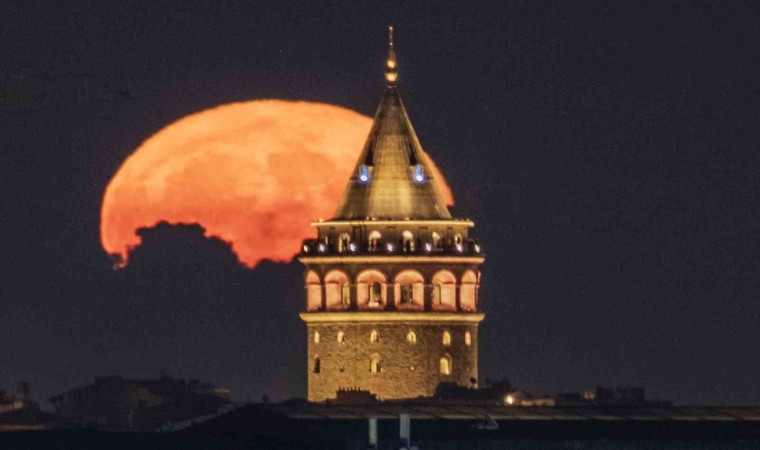İstanbul’un sembol yapılarından tarihi Galata Kulesi ile birlikte görüntülenen dolunay görenleri kendine hayran bıraktı.