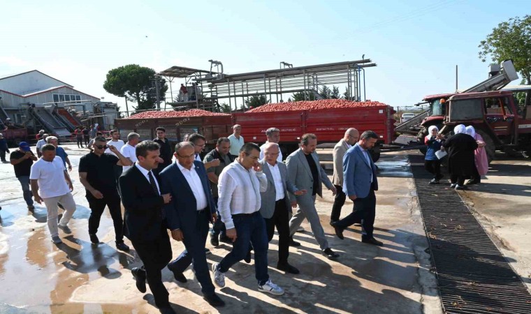 Ticaret Bakanlığı ve Tarım ve Orman Bakanlığı ile yapılan istişareler sonucunda belirlenmiş fiyat üzerinde alım yapan salça üreticilerine özel bir destek verileceğini belirten AK Parti İl Başkanı Davut Gürkan, "Karacabey ve Mustafakemalpaşa ilçelerinde çok verimli bir sezon geçiriyoruz. Bir önceki yıla göre değerlendirdiğimizde geçen sene 163 bin dekarlık bir dikim vardı. Bu sene bu oran 173 bin dekara çıkmış durumda. Bu rakamlara baktığımızda ciddi bir üretim olduğunu görüyoruz. Geçen seneye kıyasla yüzde 20’lik bir artış var. Bursa, Türkiye’nin salçalık domates üretiminin yüzde 25’lik kısmını üreten ovalara sahip. Salçalık domates üretimi noktasında Türkiye’de birinci sırada. Bu bölge domatesin üretimiyle ilgili ciddi efor sarf ediyor. Bu yüzden hem beklentileri yüksek de tarımı bunun üzerine şekillendiriyorlar. Geçen sene serbest piyasa fiyatlarının sözleşmeli fiyatları geçmesinin üzerine tarımla uğraşan hemşerilerimizin bu sene sözleşmeli fiyatlardan uzak durdu. Hem üretimin fazla olması hem de sözleşmenin az olması sebebiyle işin başlangıcında bir karışıklık oldu. Şu an çok şükür sezonun en yüksek olduğu noktadayız. Yaklaşık 15-20 gün sonra artık alımlar biraz daha düşmeye başlayacak. Bu süreçten sonra da hakikaten öncellikle Tarım ve Orman Bakanı, Ticaret Bakanı ve milletvekillerimize çok teşekkür ediyorum. Bu sezonun başından itibaren çiftçilerimizin talepleriyle alakalı ciddi bir efor sarf ettiler. Son dönemlerde de Ticaret Bakanı Ömer Bolat fiyat baremi koyarak bu fiyat baremi üzerinden alım yapan fabrikalara destek verileceğini açıkladı" dedi