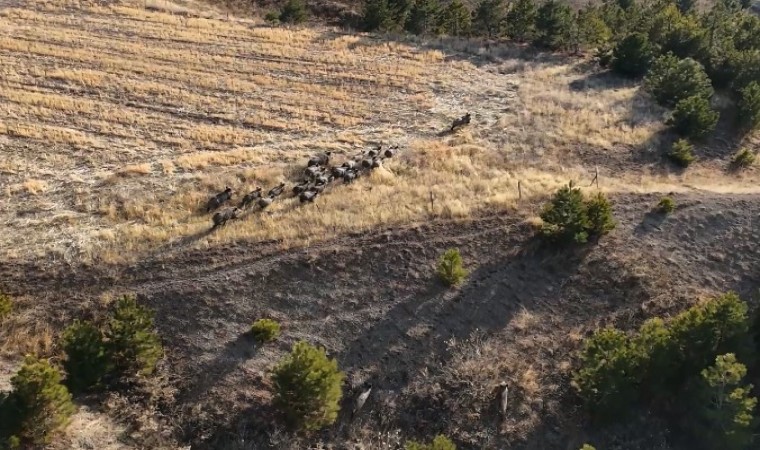 Bitlis’in Ahlat ilçesinde domuz sürüsü dron ile havadan görüntülendi.