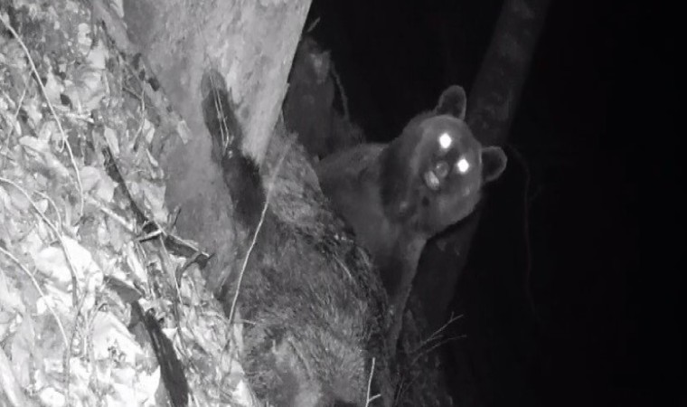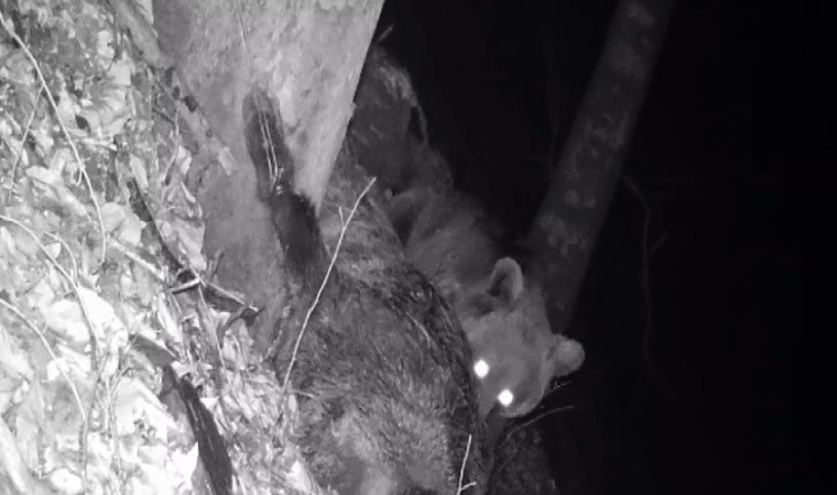 Çanakkale’nin Bayramiç ilçesi sınırlarındaki Kaz Dağları’nın kuzey yamaçlarında bir bozayının domuz yerken görüntüleri fotokapana takıldı.