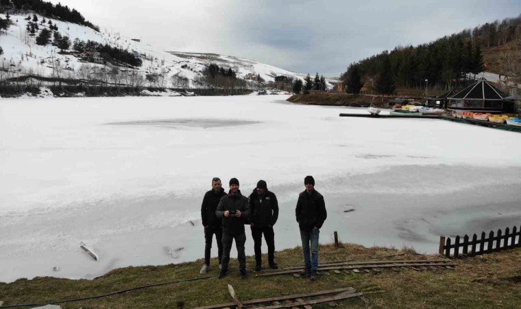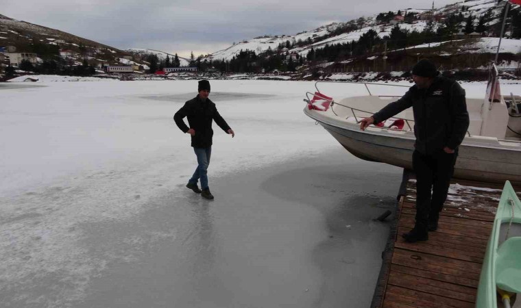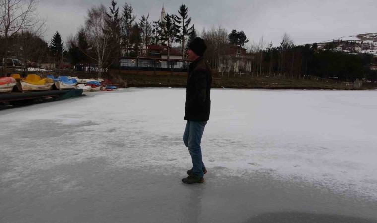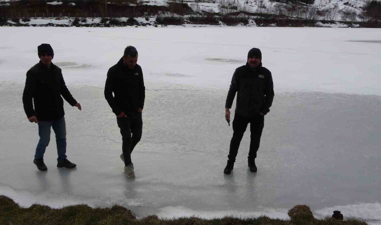 Tokat-Ordu sınırında yer alan Perşembe Yaylası’ndaki yapay gölet soğuk hava nedeniyle buzla kaplanırken, doğaseverler tehlikeye aldırış etmeden göletin üzerinde yürüdü.