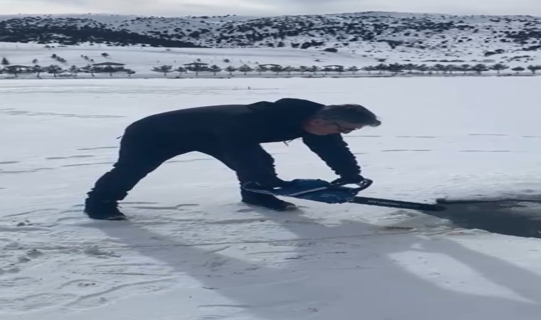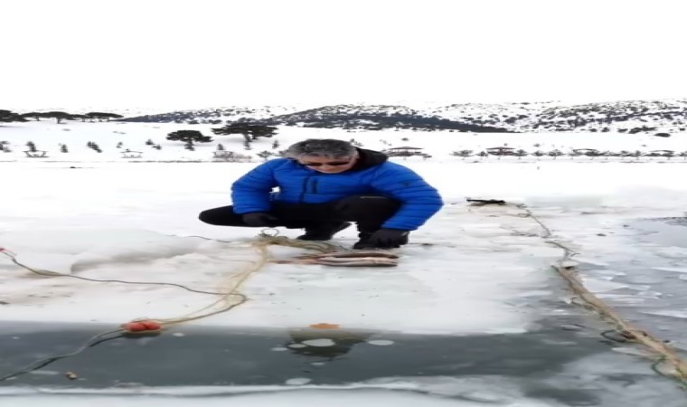 Gümüşhane’nin Kelkit ilçesindeki 1800 rakımlı Ernek Yaylası’nda vatandaşlar donan gölette buzları motorlu testereyle keserek balık avladı.