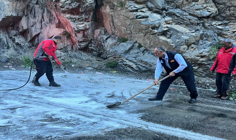 Hakkari Belediyesi itfaiye ekipleri de kara yoluna dökülen dondurma kapları ve döküntüleri toplayarak yolu köpüklü su ile yıkadı.