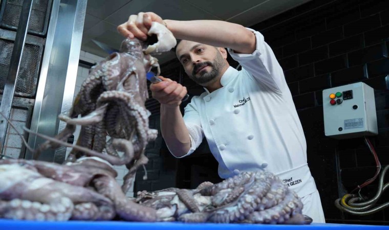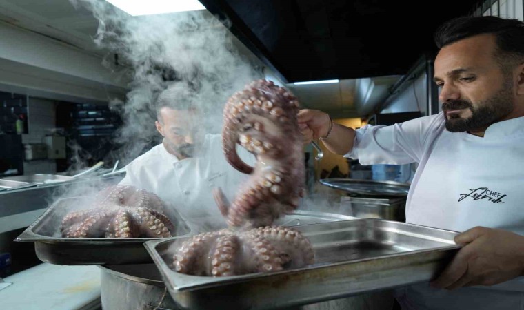 Ahtapotları önce kaynar suyun içinde beklettikten sonra döner tezgahında özel tereyağlı sosu ile hazırlayan Gezen kardeşler, yaptıkları denemeden başarılı sonuç aldı.