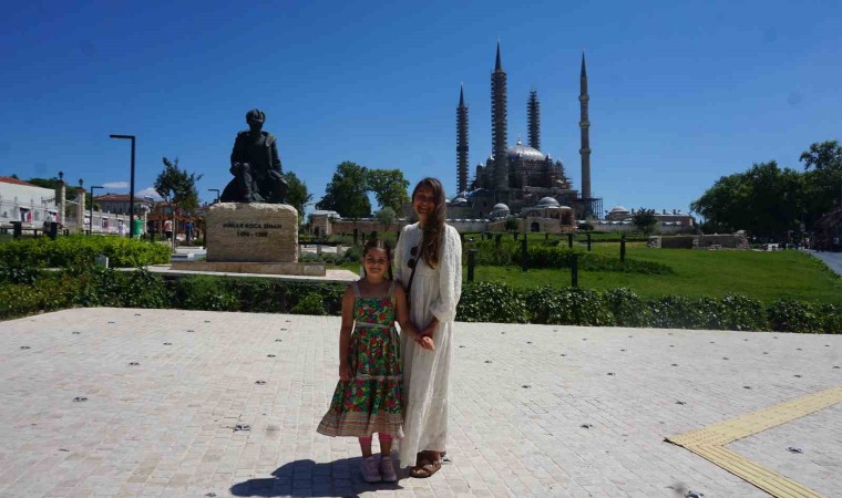 Minik gurbetçi Eliz Bozacı, kentin en işlek noktalarından birisi olan Saraçlar Caddesi’nde güvercinleri besleyerek Mimar Sinan Heykeli’nin yanına oturdu ve fotoğraf çektirdi. Kentin tarihi noktalarına hayran kalan gurbetçi aile, Cuma Namazı öncesi Selimiye Camii’ne giderek namaz kılmak istediğini belirtti.