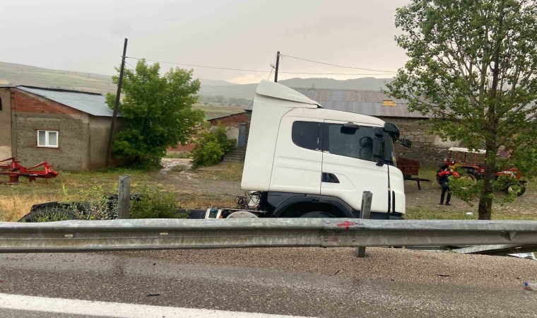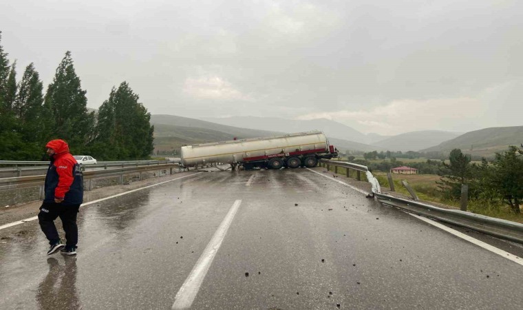 Bayburt’un Everek köyü yakınlarında dorsesi ayrılarak yola savrulan tanker, bariyerlere çarptı. Tanker sürücüsü kazayı ufak sıyrıklarla atlattı.