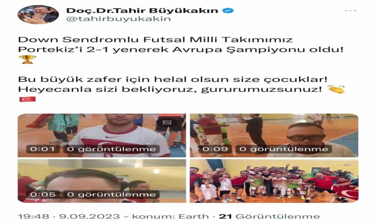 Başkan Büyükakın ise sporcuların kendisine gönderdiği vidoyu sosyal medya hesabından paylaşarak, "Down Sendromlu Futsal Milli Takımımız Portekiz’i 2-1 yenerek şampiyon oldu. Bu büyük zafer için helal olsun size çocuklar. Heyecanla sizi bekliyoruz, gururumuzsunuz" dedi.