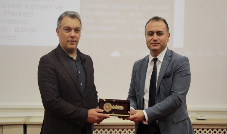 Moderatörlüğünü Kariyer ve Mezun Merkezi Koordinatörü Öğr. Gör. Bahar Yolvermez’in üstlendiği etkinlikte Erdoğan Şahin, kamu sektöründeki kariyer imkanları, sektörün kolay ve zor yanları, İŞKUR’un kamu sektöründeki rolü ve öğrencilerin iş hayatında karşılaşabilecekleri sorunlara ilişkin anlatımlarda bulundu ve çözüm önerilerini öğrencilerle paylaştı.