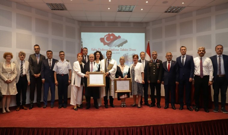 Protokol konuşmalarının ardından sahneye davet edilen Prof. Dr. Süleyman Kızıltoprak, sırasıyla Edit Tasndi ve İsmet Güral’a doktora cübbelerini giydirdi ve fahri doktora belgelerini takdim etti.