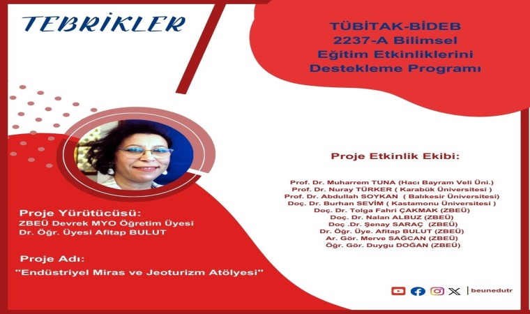 ZBEÜ Devrek MYO Öğretim Üyelerinden Dr. Öğr. Üyesi Afitap Bulut’un yürütücülüğünü üstlendiği "Endüstriyel Miras ve Jeoturizm Atölyesi" başlıklı proje TÜBİTAK tarafından desteklenmeye layık görüldü.