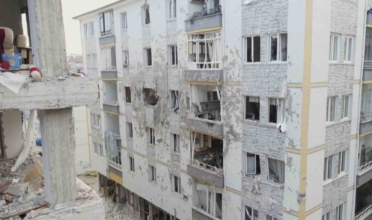 Çorum’da 1 kişinin öldüğü, 33 kişinin yaralandığı doğal gaz patlamasının yaşandığı evde ve binada oluşan hasarın büyüklüğü dron görüntüleri ile gözler önüne serildi.