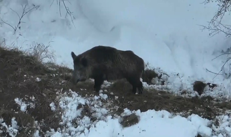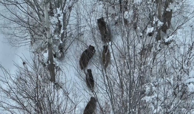 Mert Yılmaz, bu seferde karla kaplı arazide domuz sürüsünü drone ile görüntüledi. Bir yandan koyun sürüsünü otlatırken diğer yandan da karlı arazide domuz sürüsünü havadan görüntüledi.