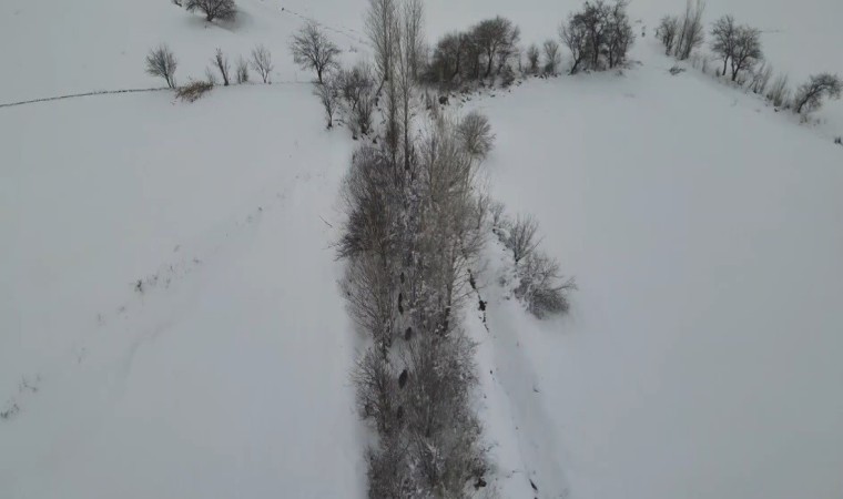 Erzincan’da karla kaplı arazide koyun sürüsünü ağaç dallarıyla beslenmeleri için dışarı çıkarak Mert Yılmaz (25), droneyle domuz sürüsünü görüntüledi.