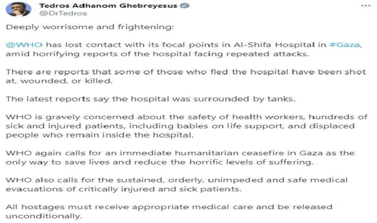 DSÖ Doğu Akdeniz Bölge Ofisi’nden yapılan açıklamada, “DSÖ, Gazze'nin kuzeyindeki Şifa Hastanesi'ndeki irtibatlarıyla iletişimini kaybetmiştir. Hastanenin art arda saldırılara maruz kaldığına dair dehşet verici haberler gelmeye devam ederken, bağlantılarımızın yerinden edilmiş on binlerce insana katıldığını ve bölgeden kaçtıklarını varsayıyoruz” denildi.