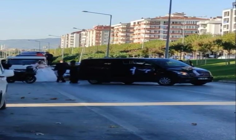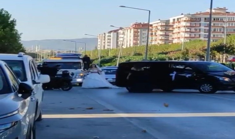 Bursa’nın Nilüfer ilçesi Fatih Sultan Mehmet Mahallesi’nde ilerleyen düğün konvoyu ana cadde üzerinde yolu kapattı. Araçtan inen gelin ve damat kimseye aldırış etmeden dakikalarca dans etti. Korna ve konvoy eşliğinde duyarsızca davranan kalabalık trafiktekileri de, mahalleliyi de bezdirdi. Görüntüler üzerine harekete geçen emniyet, sürücüleri tek tek tespit etti. Düğün aracını süren A.G.’ye ve diğer araç sürücüsü A.S.’ye “taşıt yolu üzerinde duraklamak, trafik güvenliğini tehlikeye düşürmek, ve saygısızca araç kullanmaktan” işlem yapılırken, 2 sürücüde psikotekniğe sevk edildi.