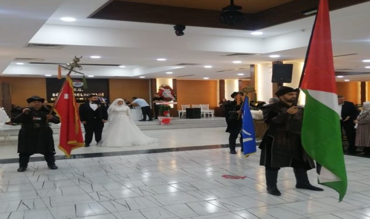 Türkiye ve Filistin bayrakları asıldığı düğün salonunda davetlilere Filistin bayraklı stickerlar hediye edildi. Düğünde İsrail’in saldırıları sonucunda Filistin’de hayatını kaybedenler için mevlit okunup dualar edildi.
