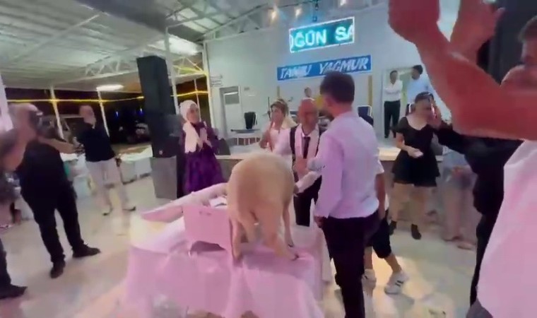 Zonguldak’ın Devrek ilçesinde bir düğünde damada arkadaşı tarafından takı yerine koyun hediye edildi.