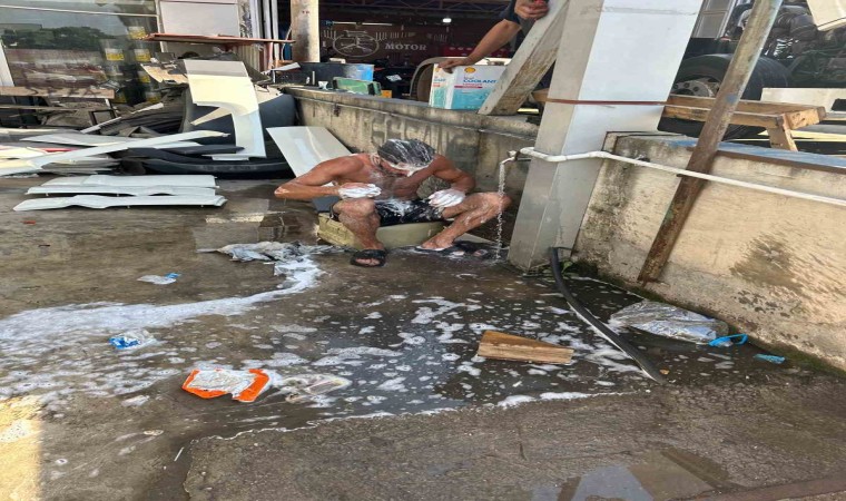 Tokat’ta sıcaktan bunalan sanayi çalışanı, dükkan önündeki musluğun altında hem serinlemeye çalışıp hemde duş almak isteyince arkadaşlarının deterjanlı şakasına maruz kaldı.