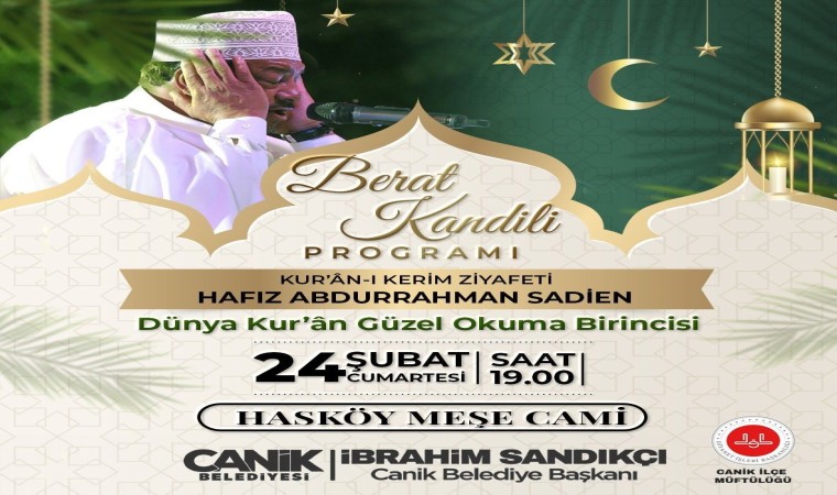 Hasköy Mahallesi’nde bulunan Hasköy Meşe Cami’nde düzenlenecek olan Berat Kandili Özel Programı’nda dünyaca ünlü Güney Afrikalı Kurra Hafız Abdurrahman Sadien gerçekleştireceği Kur’an-ı Kerim tilavetiyle gönülleri mest edecek. Farklı şehirlerden ve çevre ilçelerden vatandaşların katılım sağlaması muhtemel programda Canik Belediyesi ikramlarda bulunacak.