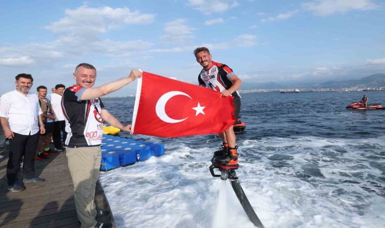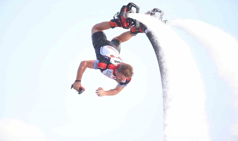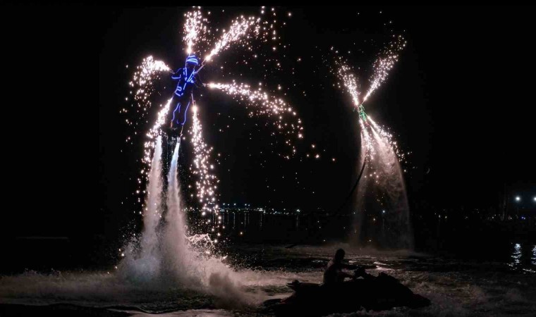 Flyboard branşında rakip tanımayan Aktaş’ın özellikle gece yarısı özel ışıklı elbiseyle denizde yaptığı flyboard şovu adeta nefesleri kesti. Rekortmen sporcu, havada sergilediği estetik manevralarla adeta yer çekimine meydan okudu.