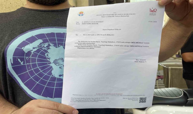Dünyanın geoit şeklinde değil de düz olduğunu savunan ve 2018 yılında kurduğu Düz Dünya Derneği altında çalışmalarını sürdüren Doğukan Özkan, Seyhan ilçesine bağlı Tepebağ Mahallesi’ndeki 27039 sokağa ’Düz Dünya Sokağı’ isminin verilmesi için belediyeye başvurdu.
