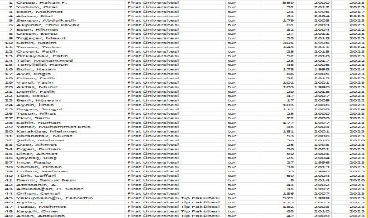 Oluşturulan listede, yüzde 2’lik dilime giren 200 bin 644 bilim insanı sıralandı. Sıralamaya Türkiye’den bin 202 öğretim üyesi girerken, bu listede Fırat Üniversitesinden 49 öğretim üyesi yer aldı. Listeye Türkiye’den en fazla akademisyeni giren üniversite, 62 akademisyenle İstanbul Teknik Üniversitesi oldu. İTÜ’yü, 49 akademisyenle Fırat Üniversitesi, 42 akademisyenle Hacettepe Üniversitesi, 42 akademisyenle Koç Üniversitesi, 38 akademisyenle Yıldız Teknik Üniversitesi, 32 akademisyenle Gazi Üniversitesi, 30 akademisyenle ODTÜ takip etti.