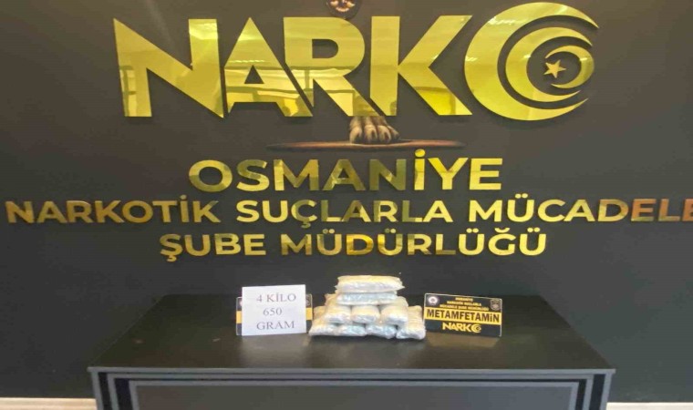 Osmaniye’de uygulama noktasında durdurulan hafif ticari araçta yapılan aramada kaput kısmında 4 kilo 650 gram metamfetamin ele geçirildi.