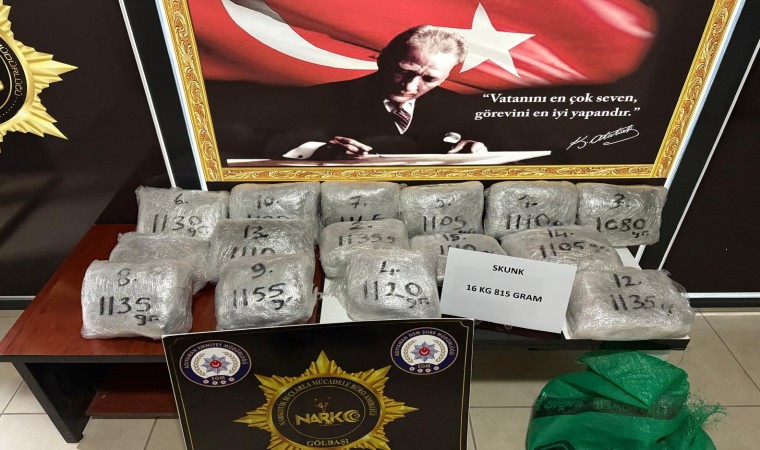 Edinilen bilgilere göre, Gölbaşı Narkotik Suçlarla Mücadele Büro Amirliği olarak Narkotik Suçlarla Mücadele Şube Müdürlüğü ve İstihbarat Şube Müdürlüğü ile koordineli yapılan çalışmalarda durdurularak kontrol edilen şüpheli araçta 15 parça halinde toplamda 16 kilogram 815 gram skunk maddesi ele geçirildi. Uyuşturucu maddeleri muhafaza altına alınırken araçta bulunan A.S. ile R.E., gözaltına alındı. Emniyette işlemleri tamamlanan her iki şahıstan A.S., çıkarıldığı mahkemece tutuklanırken R.E., ise serbest bırakıldı.