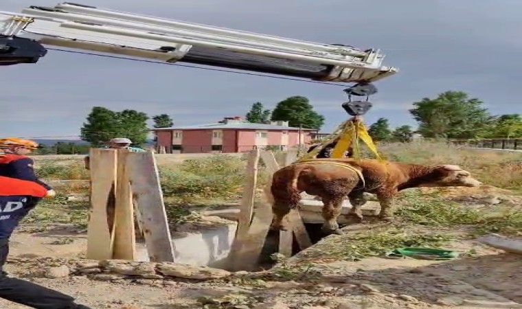 Sivas’ta Sıcak Çermik mevkiinde meydana gelen olayda otlayan bir inek üzeri açık bırakılan menfeze düştü. Sahibi ve çevredekiler ineği düştüğü yerden çıkartamayınca 112’den yardım istedi. Bölgeye itfaiye ve AFAD ekipleri yönlendirildi. İnek düzenlenen kurtarma operasyonunda vinç yardımıyla bulunduğu yerden çıkartıldı.