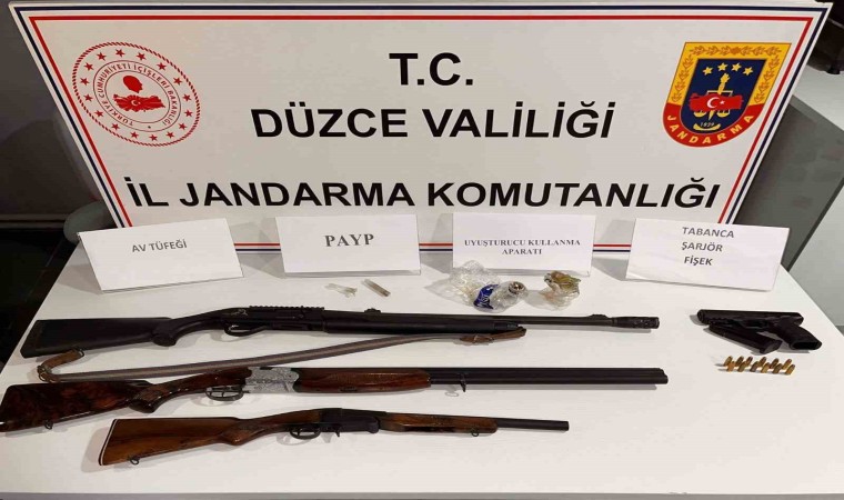 Düzce Cumhuriyet Başsavcılığı’nın koordinesi ve talimatları doğrultusunda, uyuşturucu madde imal ve ticaretinin önlenmesi ve şüpheli şahısların yakalanmasına yönelik İl Jandarma Komutanlığınca yürütülen takipli narkotik faaliyeti kapsamında Merkez ve Gölyaka İlçe Jandarma Komutanlığı sorumluluk bölgelerinde 5 şahsa ait 6 adreste eş zamanlı adli arama faaliyeti icra edildi. Aramalarda 1 adet 9 mm. çapında tabanca, 3 adet ruhsatsız av tüfeği, 471 gram kubar esrar, 1 adet uyuşturucu öğütme aparatı, 27 gram kenevir tohumu ve 3 adet uyuşturucu kullanma aparatı ele geçirildi. Soruşturmada teknik takip yapılan bir şüpheli tutuklandı. Şüpheli şahıstan uyuşturucu madde satın aldığı tespit edilen 3 kişi hakkında ise uyuşturucu madde kullanmak suçundan adli işlem yapıldı.