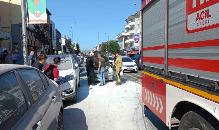 Düzce’de seyir halindeki otomobilin motor kısmında yangın çıktı. İtfaiye ekiplerinin söndürdüğü yangında araçta hasar oluştu.