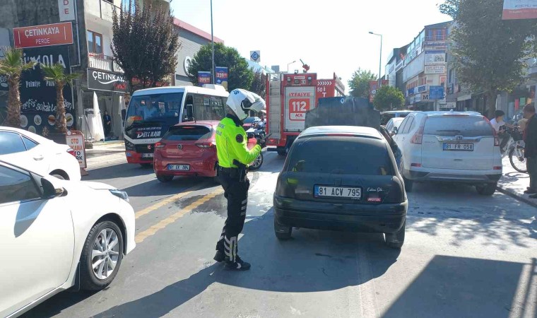 Olay, Atatürk Bulvarı’nda meydana geldi. Edinilen bilgiye göre, 81 ACY 795 plakalı otomobilin motor kısmından dumanların yükseldiğini gören sürücü, otomobilden inerek itfaiye ekiplerini aradı. Kısa sürede bölgeye gelen ekipler, aracın motor kısmından yükselen alevleri söndürdü. Olay sebebiyle kontrollü verilen trafik, aracın kaldırılmasının ardından normal seyrine döndü. Yangında otomobilde maddi hasar meydana geldi.
