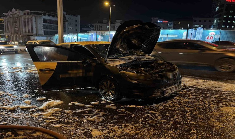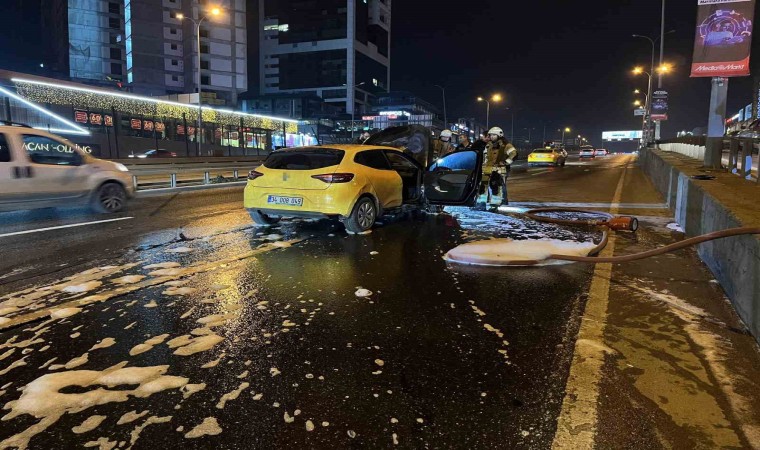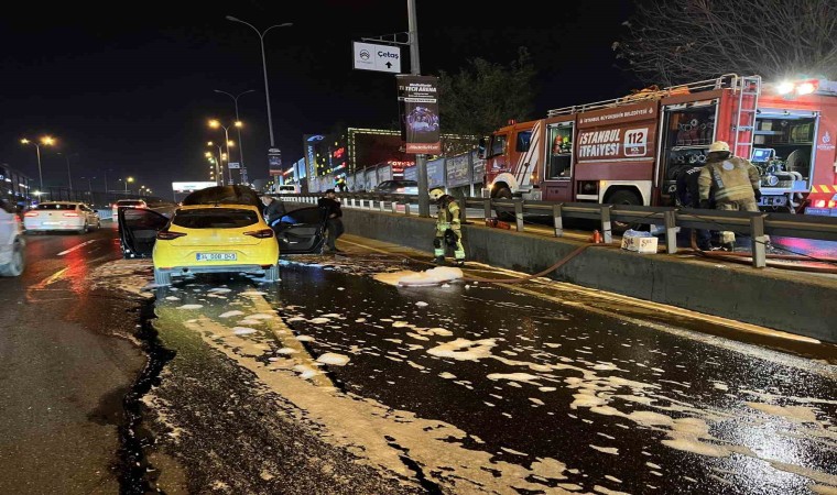Beylikdüzü E-5 karayolunda seyir halindeki bir otomobil bilinmeyen nedenle alev alev yandı. Olay anı cep telefonu kamerasına yansıdı.