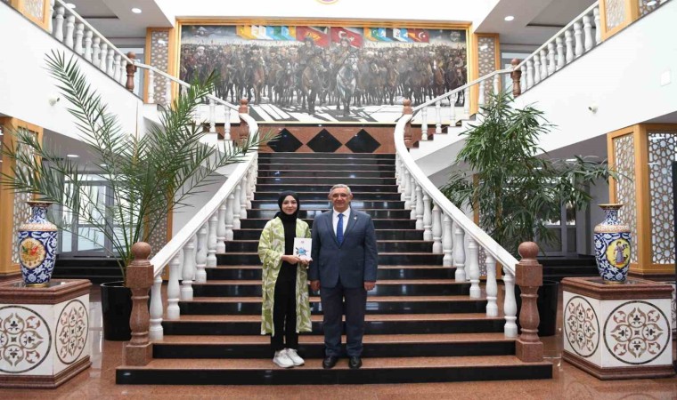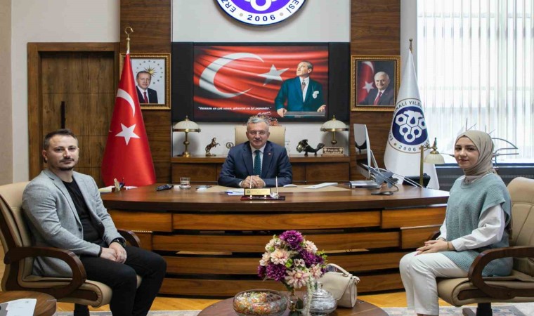 Türk Dünyası Dijital Vatandaşlığı projesinde başarılı olan Erzincan Binali Yıldırım Üniversitesi (EBYÜ) Eğitim Fakültesi Okul Öncesi Öğretmenliği öğrencisi Sena Nur Can, Rektör Prof. Dr. Akın Levent’i ziyaret etti.