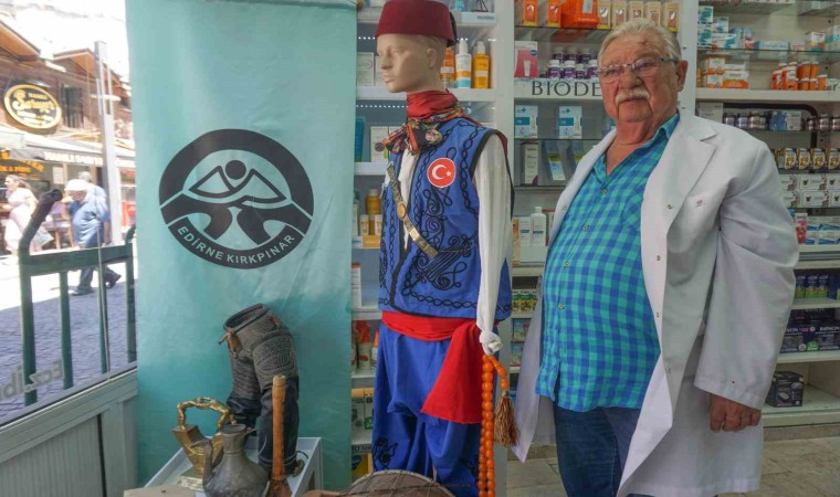 Edirneli bir eczacı, Tarihi Kırkpınar Yağlı Güreşleri’nin yapılacağı hafta eczanesine Kırkpınar köşesi kurdu.