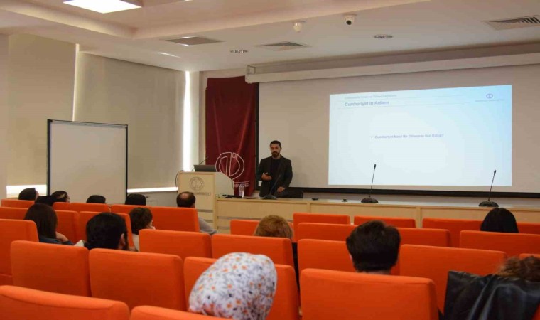 Öğr. Gör. Dr. İbrahim Sarı, konferanstaki konuşmasında şu sözlere yer verdi: “Cumhuriyetin Anlamı ve Türkiye Cumhuriyeti’ diye bir başlık seçtik daha genel olsun diye fakat bugün asıl bahsetmek istediğim konu cumhuriyetin ne demek olduğu, kavramsal anlamı ve bizim için neden önemli olduğu. Bizler cumhuriyete halkın kendi kendini yönetmesi diye açıklıyoruz ama aslında bu kavramı içselleştirmemiz gerekiyor. Öncesinde bir saltanat vardı ve yönetim bir aileye aitti; cumhuriyet bunu reddediyor. Cumhuriyet, halkın menfaatlerinin korunmasına en büyük aday çünkü temelinde seçim esası var. Atatürk’ün attığı her adım demokratik bir toplum kurma üzerineydi. Onların cumhuriyetten anladıkları demokrasiydi. Biz bugünden baktığımızda bazı şeyleri göremiyoruz, bir imparatorluk yıkılıyor bu büyük bir olay. Atatürk, Türk aydınlanmasının getirdiği kişilerden olmasının yanında o dönemde dünyanın gittiği yönü, gelişmeleri gören ve bir halk yönetimi getirmeye çalışan biriydi” ifadelerini kullandı.