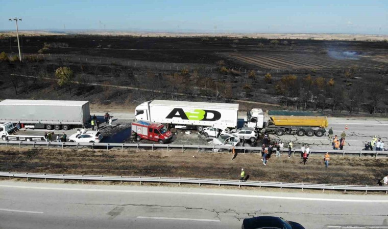Edirne’de meydana gelen zincirleme trafik kazasıyla ilgili detaylar ortaya çıktı. Edirne - Kırklareli yolu Köseömer mevkii üzerinde yol kenarındaki otların yakılmasıyla ortaya çıkan dumanın neden olduğu zincirleme kazanın ardından bölgeye gelen Edirne Valisi Yunus Sezer, incelemelerde bulundu. Vali Sezer yaptığı açıklamada, "Bugün öğleden sonra 12 aracın karıştığı bir trafik kazası var. Her iki şeritte de aynı anda trafik kazası oluyor. Zannediyorum Edirne istikametine yani bulunduğumuz şeritte bir de örtü yangını var. Oradan dolayı dikkatsizlikten ya da yangının etkisiyle olmuş olabilir. Bunlar öngörü hepsi inceleme sonrasında ortaya çıkacak. 12 tane araç karışmış durumda maalesef bir tane hayatını kaybeden vatandaşımız var. 36 tane de hafif şekilde yaralanan bir şekilde kazadan etkilenenler var. Bir kazazedemizin durumu biraz ağır gözüküyor. Arkadaşlarımız müdahale ettiler, inşallah kısa sürede sağlığına kavuşur. Geçmiş olsun diliyoruz. Gerekli tedbirler alındı. Yaralıların tamamı hastaneye sevk edildi" dedi.