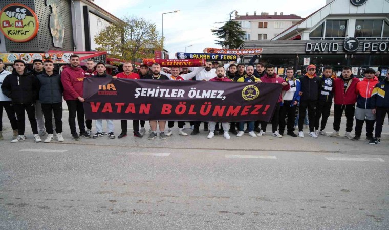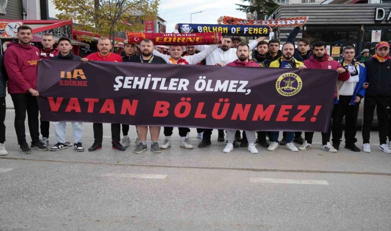 Edirne’de Galatasaray ve Fenerbahçe taraftarları bir araya gelerek, maç öncesi Pençe-Kilit Operasyonu bölgesinde şehit düşen ve yaralanan Mehmetçikler için pankart açarak teröre tepki gösterdi.