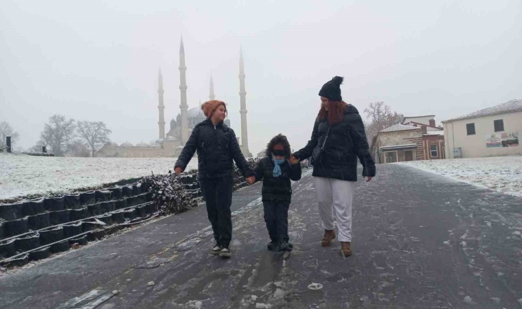 Edirne’de öğleden sonra özellikle yüksek kesimlerde yağmurla karışık kar yağışı etkili oldu. Zaman zaman yerini yağmura bırakan kar yağışının gece ve yarın da yer yer etkili olması beklenirken, Mimar Sinan’ın "Ustalık eserim" dediği Selimiye Camii ve meydanı karla kaplandı.