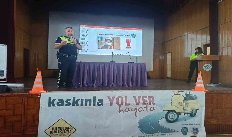 Trafik polisleri tarafından Halk Eğitim Merkezi çok amaçlı salonda gerçekleştirilen eğitimde motosiklet sürücülerinin uyması gereken kurallar, temel motosiklet bilgisi, kask takmanın önemi, trafikte saygılı ve hoşgörülü olma konularında bilgi verildi.