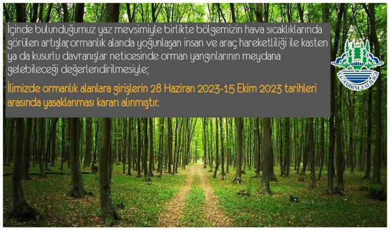 EDİRNE VALİLİĞİ, YANGINLARIN ÖNLENMESİ AMACIYLA ORMANLIK ALANLARA GİRİŞLERİN YASAKLANDIĞINI DUYURDU.