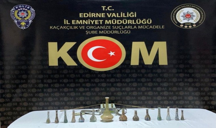 Edirne İl Emniyet Müdürlüğü’ne bağlı Kaçakçılık ve Organize Suçlarla Mücadele Şube ekipleri, yaptığı denetimlerde şüphelendikleri bir otomobili durdurdu. Durdurulan otomobilde yapılan aramada Roma dönemine ait olduğu öğrenilen 14 cam gözyaşı şişesi ve 3 define arama cihazı bulundu. Ele geçirilen Roma dönemine ait 14 tarihi obje ekipler tarafından muhafaza altına alındı. Otomobilde bulunan 2 şüpheli gözaltına alındı.