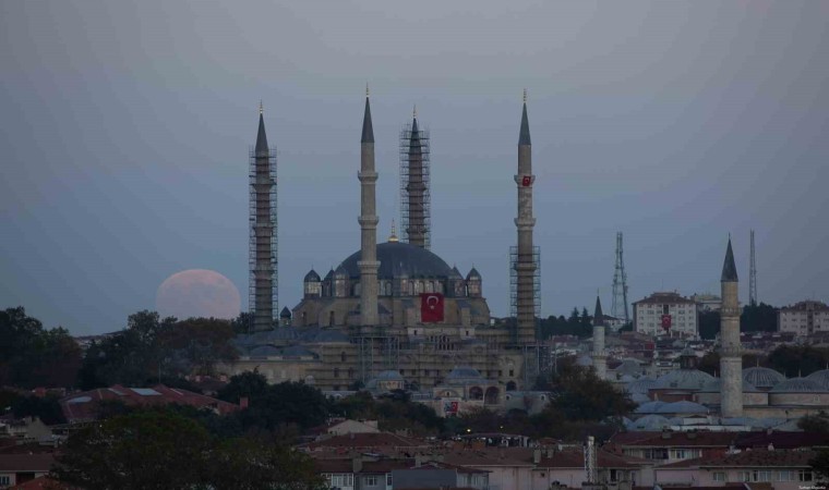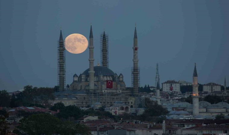 Edirne’de akşam saatlerinde gökyüzünde beliren dolunay, Selimiye Camii ile birlikte görenleri hayran bırakacak görüntüler oluşturdu. Gün batımının ardından beliren dolunay, kentteki tarihi eserlerle ayrı bir görsel şölen sundu.