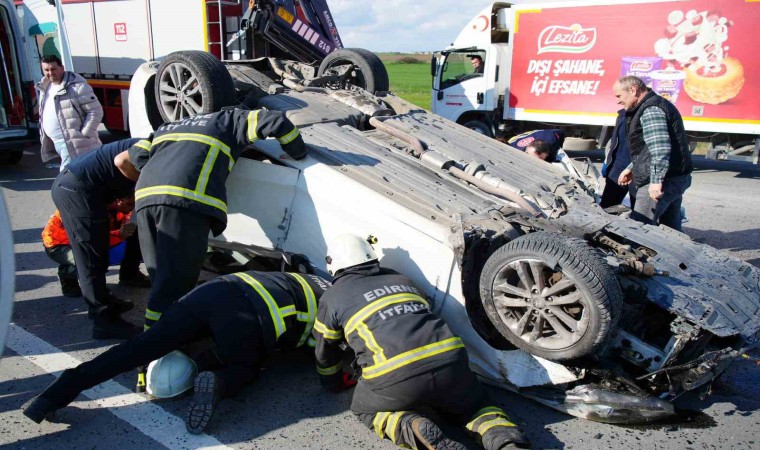 Edirne’de kontrolden çıkan otomobilin takla attığı kazada araç içinde sıkışan sürücü itfaiye ve sağlık ekiplerinin müdahalesiyle kurtarıldı.