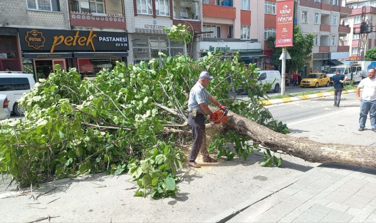 Edirne’de trafiğin en yoğun olduğu Kıyık Caddesi’nde ticari taksinin üzerine devrilen ağaç, yaklaşık 2 saat boyunca trafik akışını engelledi.