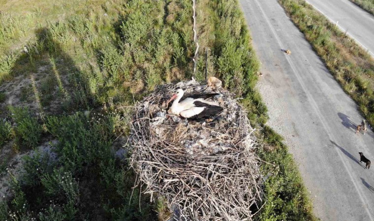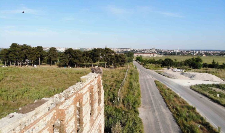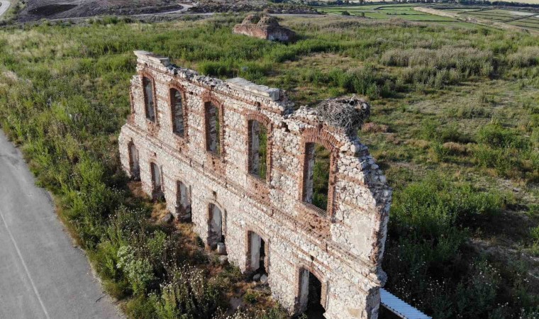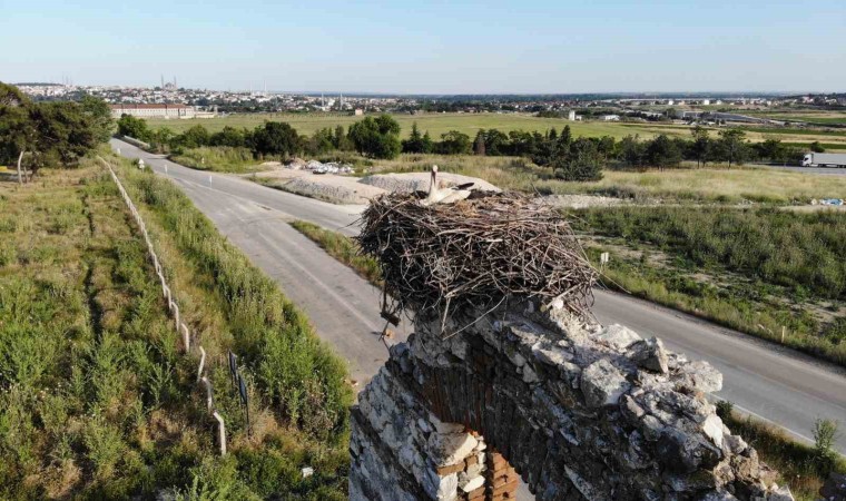 Edirne’de tek duvarı kalan tarihi asker hastanesi göçmen kuşu leyleklere yuva oldu.