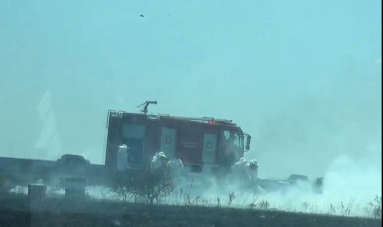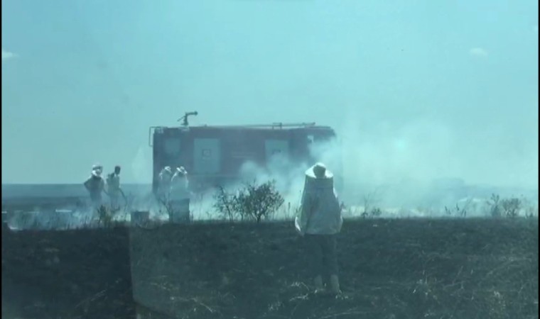 Edirne’de tarlada çıkan yangın nedeniyle 100 arı kovanı ve 50’ye yakın saman balyası kül oldu.