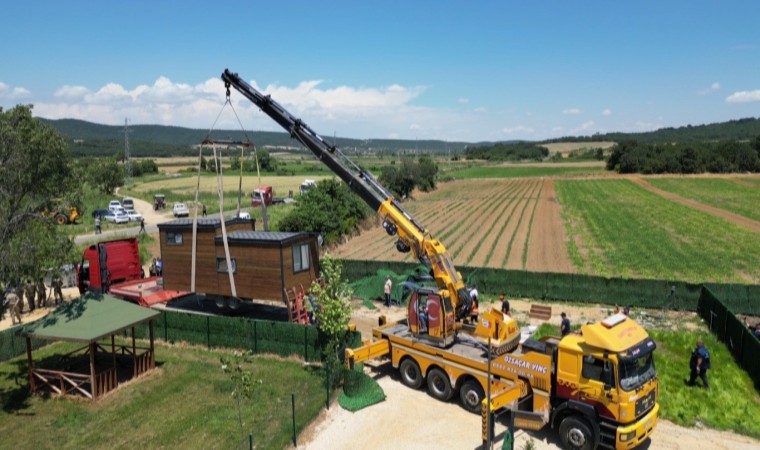İş makineleriyle açılan yoldan araziye ulaşan ekipler, bazı "tiny house"ları vinç yardımıyla yerinden alarak, başka alana götürdü.