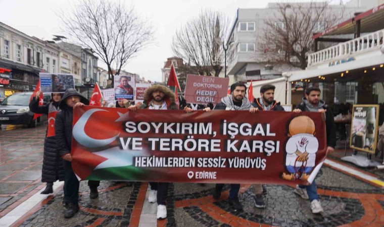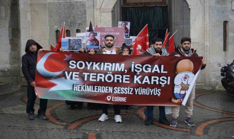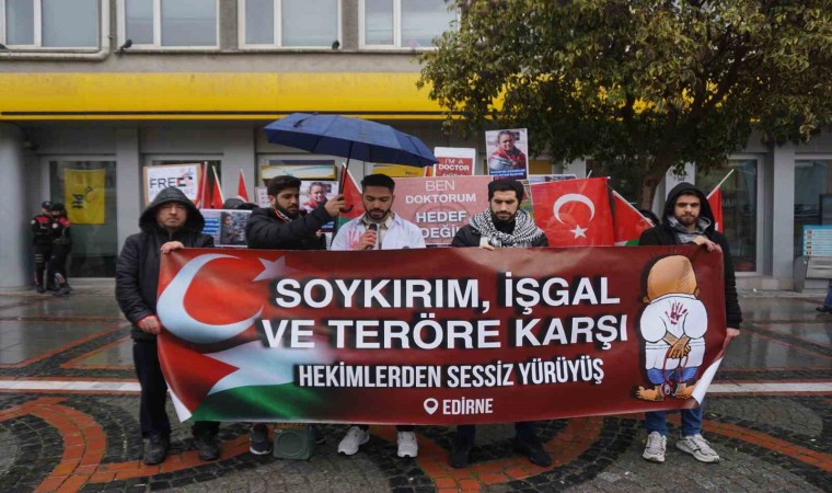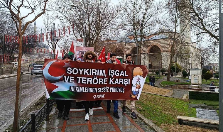 Edirne’de Tıp Fakültesi öğrencilerinin terör, soykırım ve işgale karşı tepki göstermek amacıyla başlattığı sessiz yürüyüş yağışlı havaya rağmen bu hafta da gerçekleştirerek, İsrail’i protesto etti.