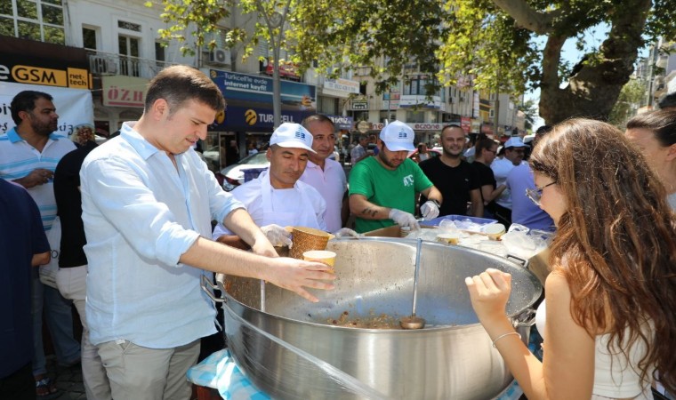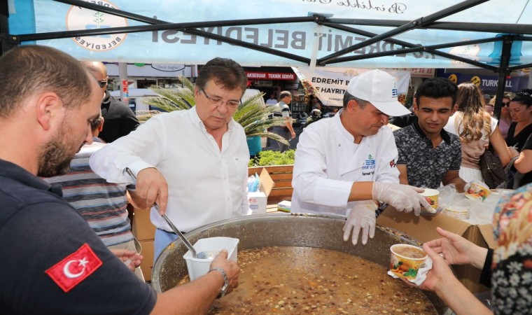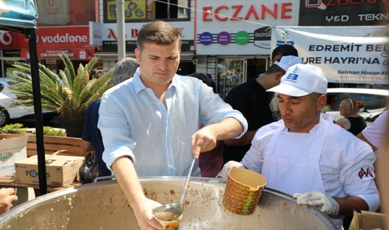 Balıkesir’in Edremit Belediyesi, Muharrem ayı dolayısıyla aşure hayrı düzenledi. Cumhuriyet Meydanı’nda 15 bin kişilik aşure dağıtılırken Edremit Belediye Başkanı Selman Hasan Arslan, vatandaşlara aşure ikramı yaptı.